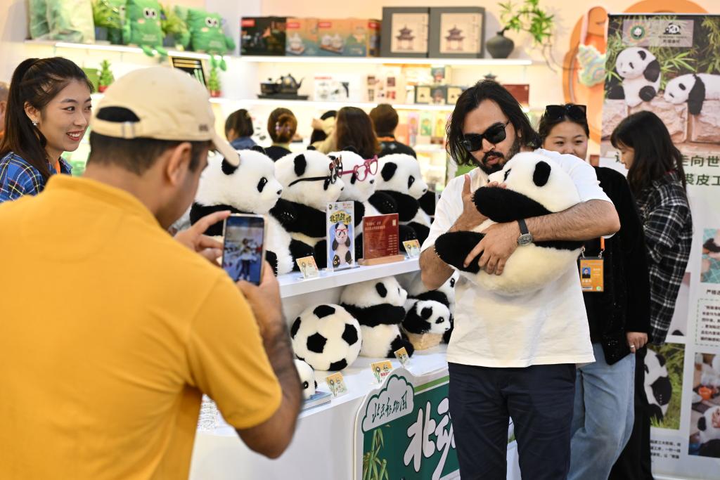 2024年9月16日,國外參觀者在服貿會首鋼園區(qū)文旅服務專題展區(qū)抱著北京動物園推出的大熊貓文創(chuàng)玩偶合影。新華社記者 李鑫 攝