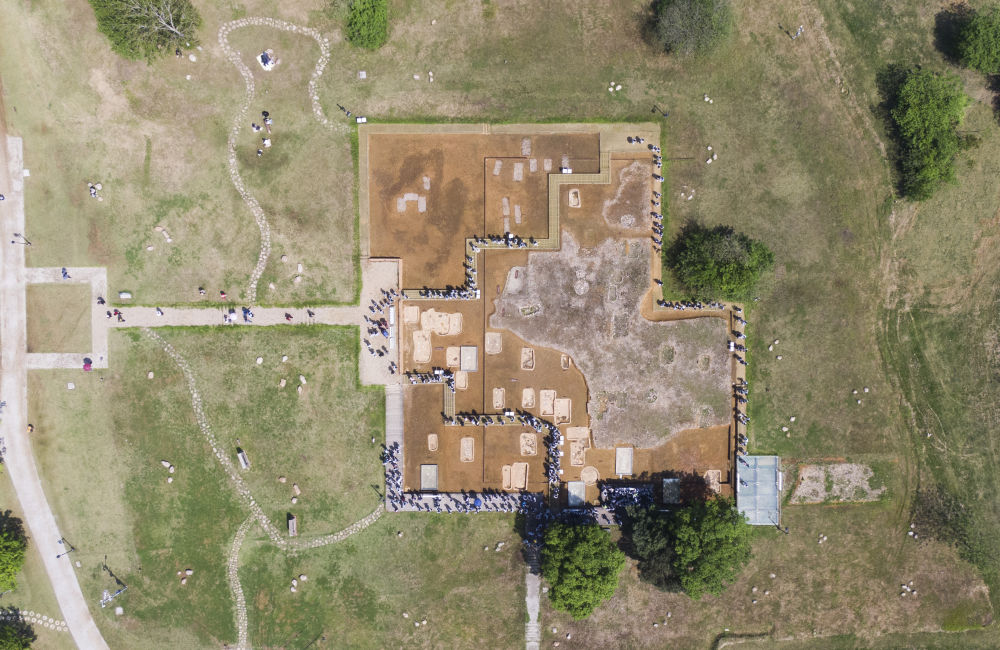 這是2024年4月18日拍攝的位于安徽省馬鞍山市含山縣境內(nèi)的凌家灘國(guó)家考古遺址公園墓葬祭祀?yún)^(qū)(無人機(jī)照片)。新華社記者 傅天 攝