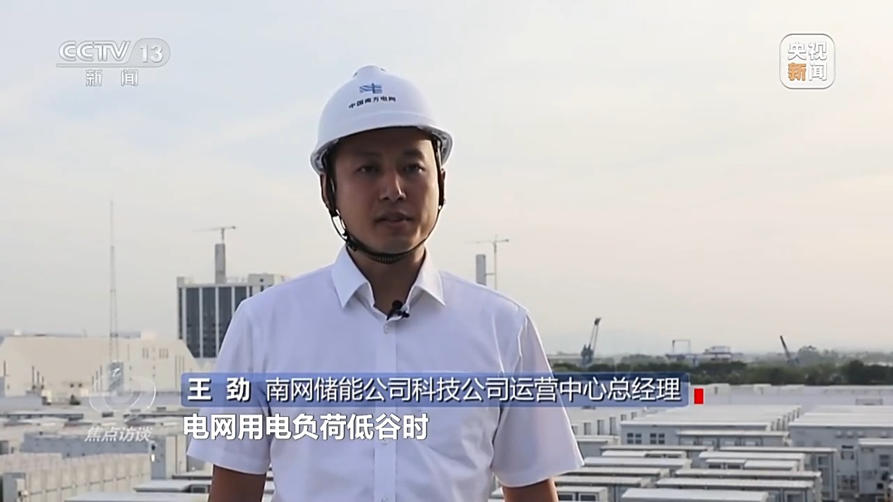 南網(wǎng)儲(chǔ)能公司科技公司運(yùn)營中心總經(jīng)理 王勁:電網(wǎng)用電負(fù)荷低谷時(shí),把電廠發(fā)出的多余的電儲(chǔ)存到250個(gè)電池儲(chǔ)能柜內(nèi),用電高峰時(shí),把電池儲(chǔ)能柜里的電能釋放出來支持電網(wǎng)的電力供應(yīng)。