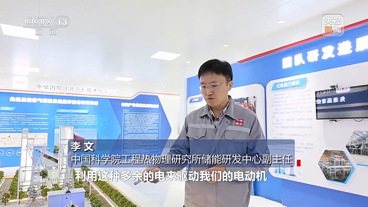 中國科學(xué)院工程熱物理研究所儲(chǔ)能研發(fā)中心副主任 李文:利用多余的電來驅(qū)動(dòng)電動(dòng)機(jī),帶動(dòng)壓縮機(jī)把空氣壓縮到高壓狀態(tài),最后存儲(chǔ)到儲(chǔ)氣裝置中,在有需要的時(shí)候,我們利用所存儲(chǔ)的高壓空氣來驅(qū)動(dòng)膨脹機(jī),帶動(dòng)發(fā)電機(jī)進(jìn)行做功發(fā)電。