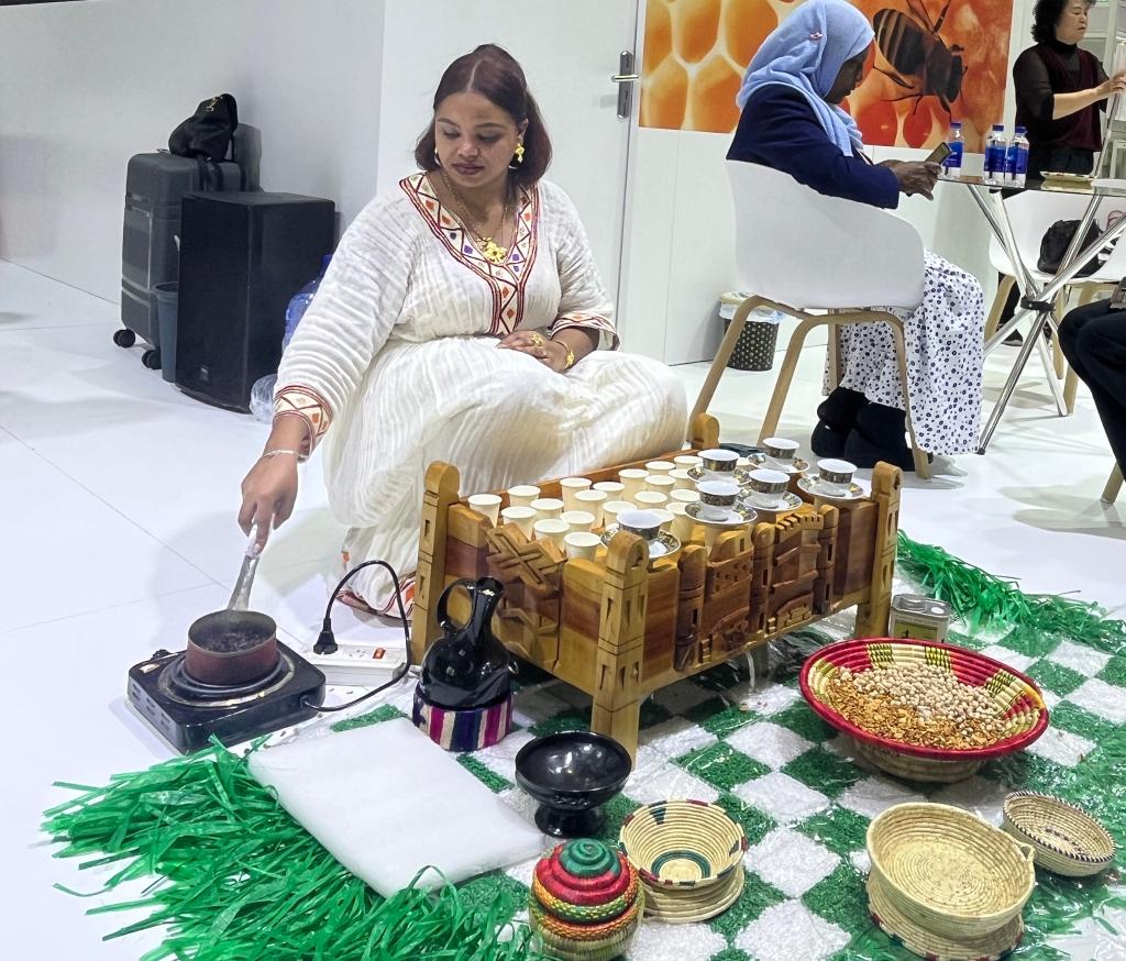 在埃塞俄比亞國(guó)家館展區(qū),埃塞俄比亞咖啡師在現(xiàn)場(chǎng)烘焙咖啡豆,展示當(dāng)?shù)乜Х任幕?。(受訪者供圖)