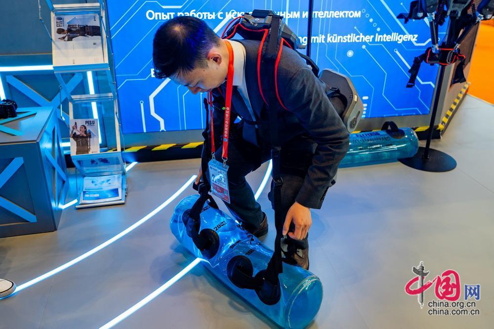 觀眾體驗外骨骼機器人在工作中的實際應用。中國網記者