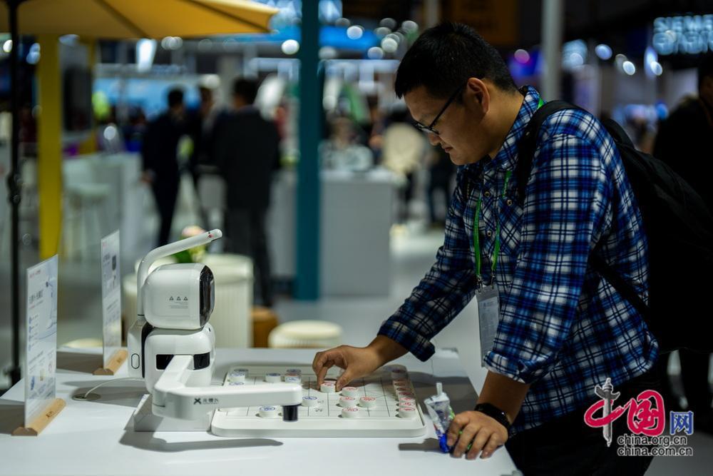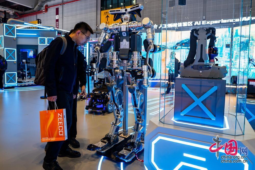 觀眾在智能裝備展示區(qū)圍觀新型外骨骼機器人。中國網記者
