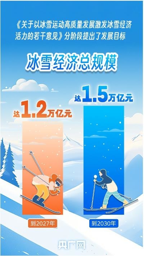 近日,國(guó)務(wù)院辦公廳公開發(fā)布《關(guān)于以冰雪運(yùn)動(dòng)高質(zhì)量發(fā)展激發(fā)冰雪經(jīng)濟(jì)活力的若干意見》(以下簡(jiǎn)稱《意見》),分階段提出發(fā)展目標(biāo):到2027年,冰雪運(yùn)動(dòng)場(chǎng)地設(shè)施更加完善,服務(wù)水平顯著提升,冰雪運(yùn)動(dòng)更加廣泛開展,冰雪經(jīng)濟(jì)總規(guī)模達(dá)1.2萬(wàn)億元。到2030年,冰雪經(jīng)濟(jì)主要產(chǎn)業(yè)鏈條實(shí)現(xiàn)高水平協(xié)調(diào)融合發(fā)展,冰雪消費(fèi)成為擴(kuò)大內(nèi)需的重要增長(zhǎng)點(diǎn),冰雪經(jīng)濟(jì)總規(guī)模達(dá)1.5萬(wàn)億元。
