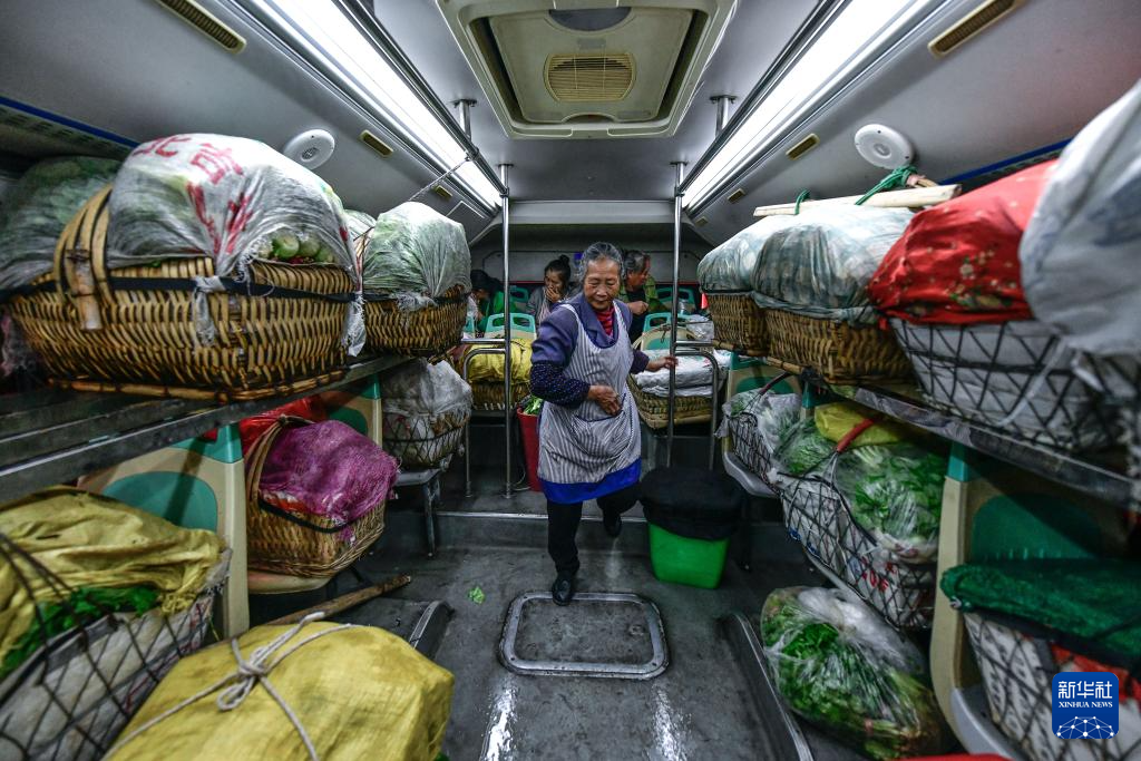菜農(nóng)從貴陽市烏當(dāng)區(qū)水田鎮(zhèn)定扒村乘坐252路“惠農(nóng)專線”公交車進(jìn)城賣菜(11月7日攝)。