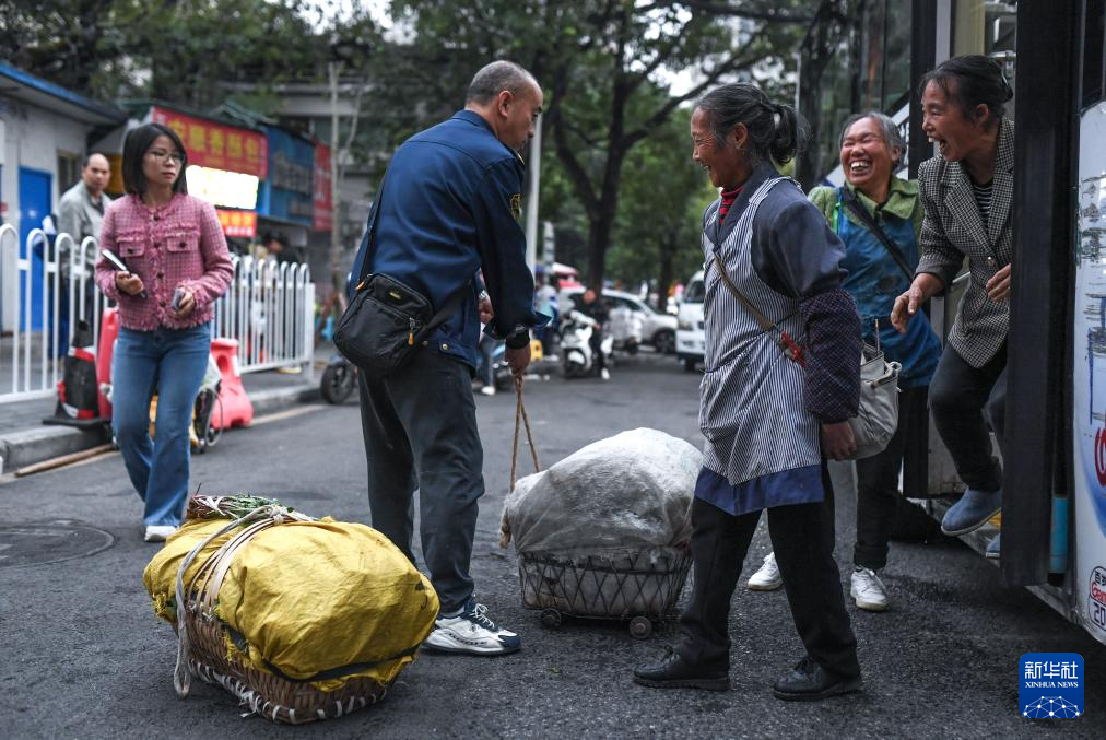 菜農(nóng)乘坐252路“惠農(nóng)專線”公交車抵達(dá)貴陽市大營坡終點(diǎn)站下車時與搭手幫忙的駕駛員交談(11月7日攝)。