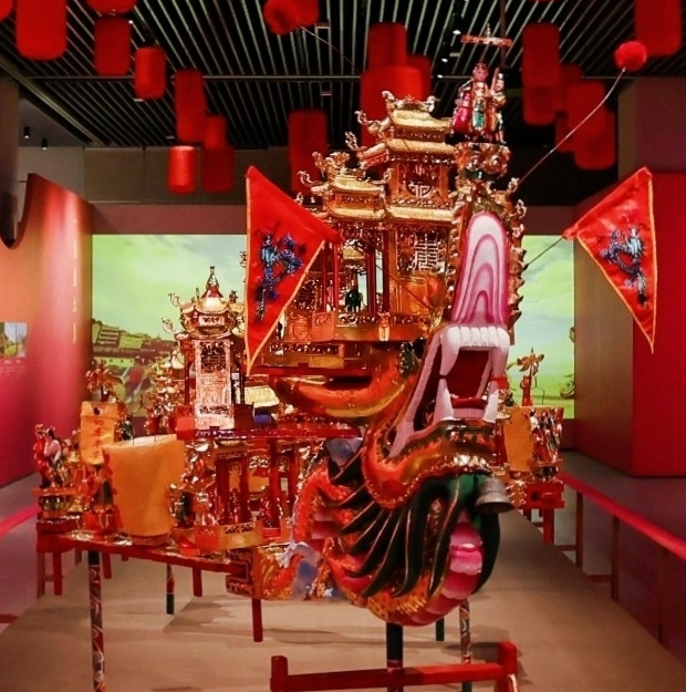 威風(fēng)凜凜,華麗無(wú)比的龍檔蜿蜒穿村而過(guò),而領(lǐng)頭的還有一件巧奪天工的龐然大物——首飾龍。