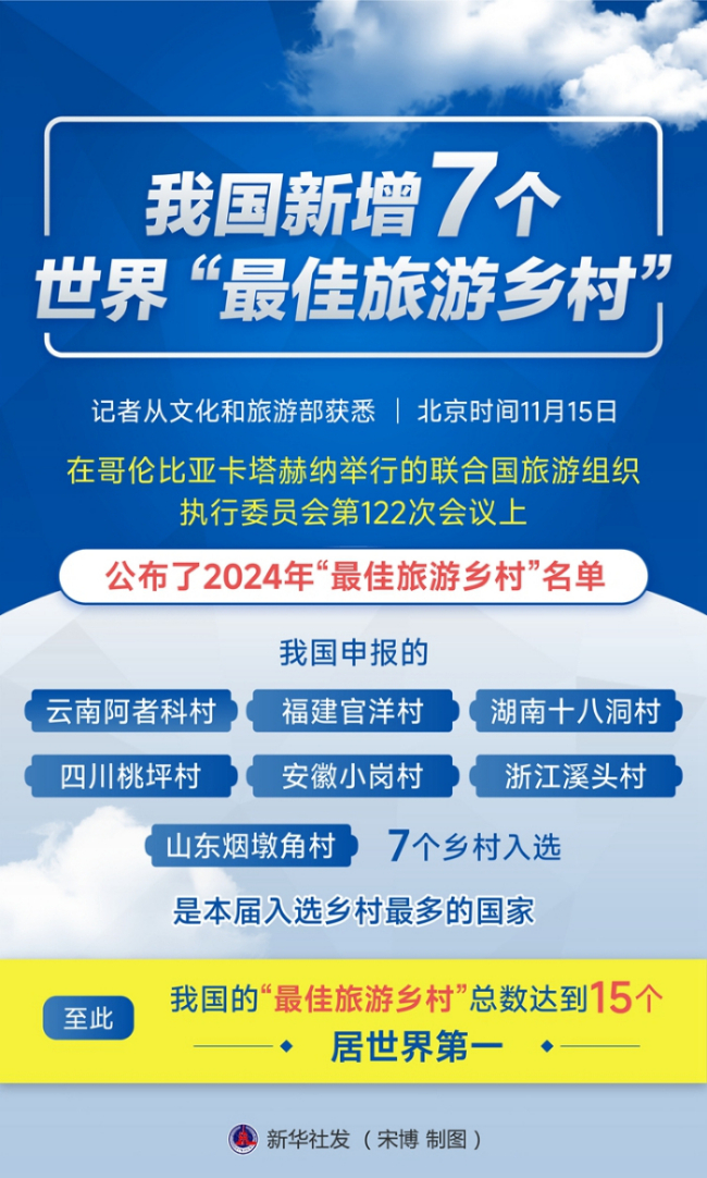 記者從文化和旅游部獲悉,北京時(shí)間11月15日,在哥倫比亞卡塔赫納舉行的聯(lián)合國(guó)旅游組織執(zhí)行委員會(huì)第122次會(huì)議上,公布了2024年“最佳旅游鄉(xiāng)村”名單,我國(guó)申報(bào)的云南阿者科村、福建官洋村、湖南十八洞村、四川桃坪村、安徽小崗村、浙江溪頭村、山東煙墩角村7個(gè)鄉(xiāng)村入選,是本屆入選鄉(xiāng)村最多的國(guó)家。