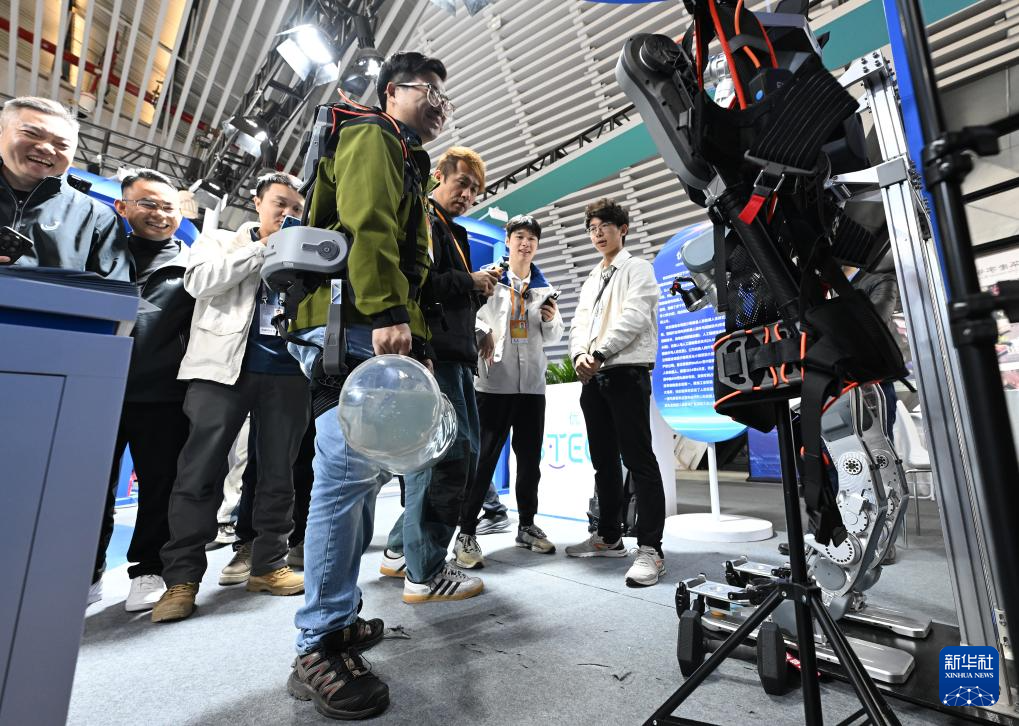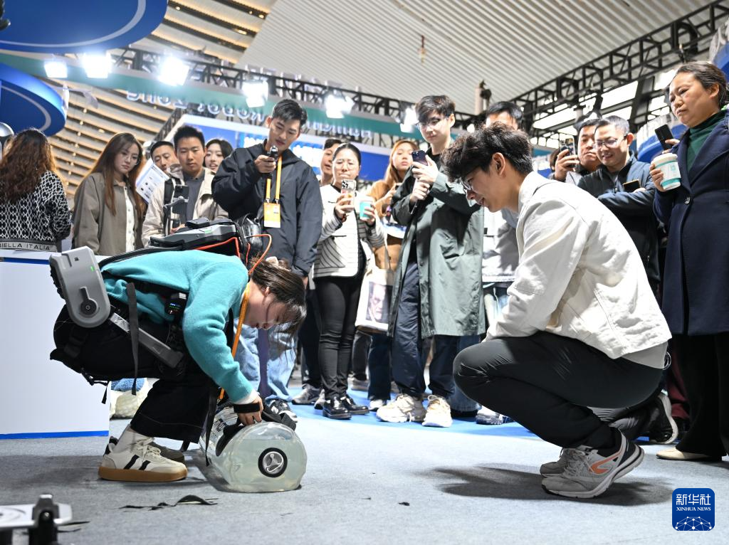 11月19日,在2024年世界互聯(lián)網(wǎng)大會“互聯(lián)網(wǎng)之光”博覽會上,參觀者體驗(yàn)外骨骼機(jī)器人協(xié)助搬運(yùn)重物。