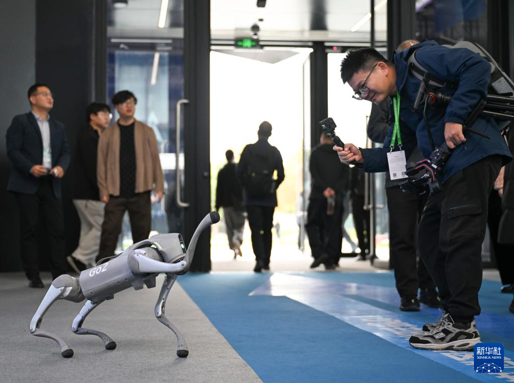 11月19日,在2024年世界互聯(lián)網(wǎng)大會“互聯(lián)網(wǎng)之光”博覽會上,參觀者與一款智能機(jī)器狗互動。