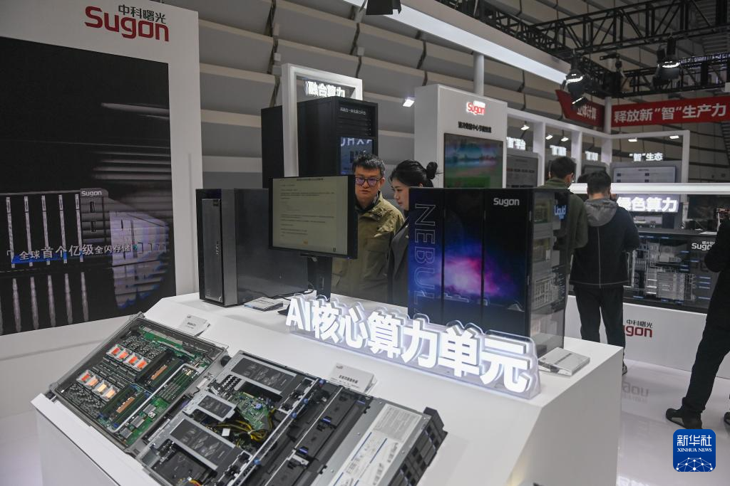 11月19日,在2024年世界互聯(lián)網(wǎng)大會“互聯(lián)網(wǎng)之光”博覽會上,觀眾在中科曙光展臺參觀AI核心算力單元的設(shè)備。