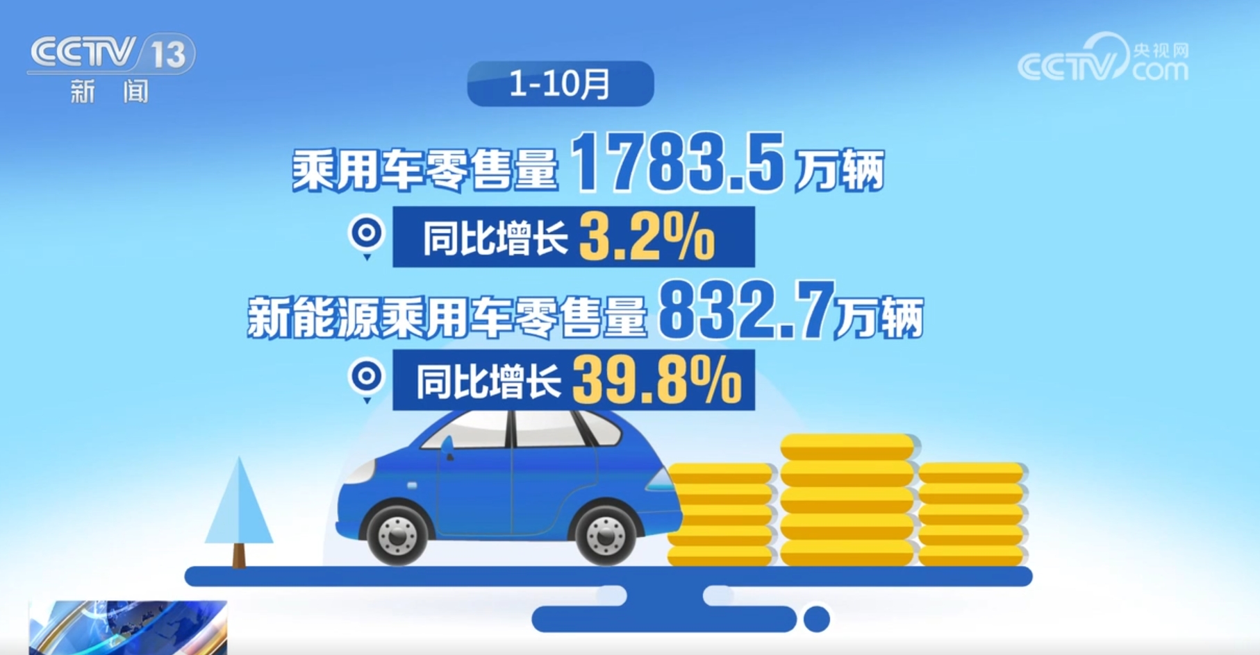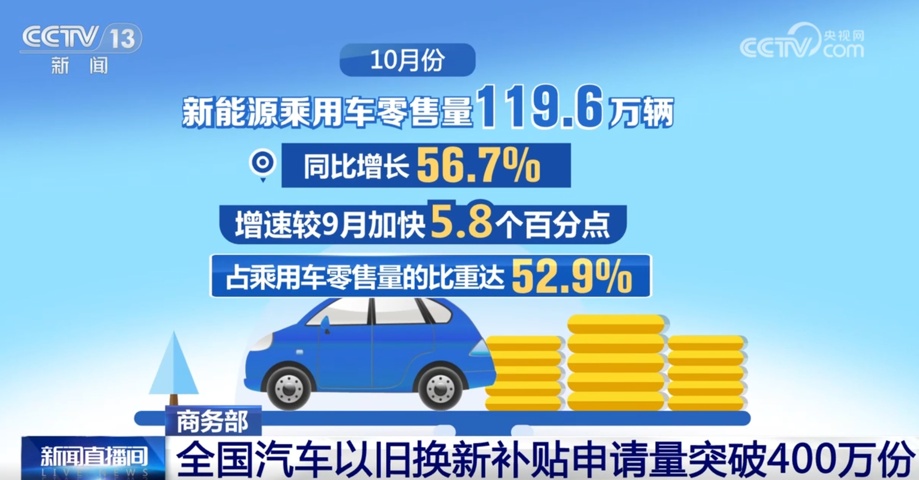 在以舊換新政策的帶動(dòng)下,汽車銷量也有了明顯增長(zhǎng)。10月份,乘用車零售量226.1萬(wàn)輛,同比增長(zhǎng)11.3%,增速較9月加快6.8個(gè)百分點(diǎn)。其中,新能源乘用車零售量119.6萬(wàn)輛,同比增長(zhǎng)56.7%,增速較9月加快5.8個(gè)百分點(diǎn),占乘用車零售量的比重達(dá)52.9%。1—10月,乘用車零售量1783.5萬(wàn)輛,同比增長(zhǎng)3.2%。其中,新能源乘用車零售量832.7萬(wàn)輛,同比增長(zhǎng)39.8%。
