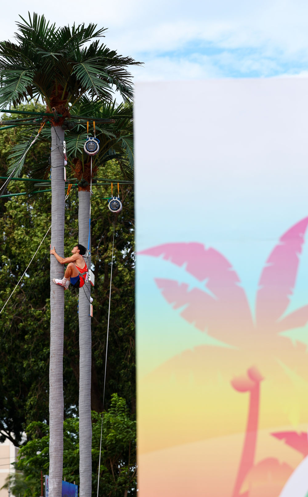 相比在運(yùn)動(dòng)會(huì)上歷史悠久的龍舟,當(dāng)日上演的攀椰競(jìng)速則是在本屆賽事首次撞入人們的眼簾。在椰子樹上手腳并用攀爬,迅速抵達(dá)頂端,不問(wèn)可知,這一競(jìng)技性與趣味性兼具的運(yùn)動(dòng)脫胎于海南當(dāng)?shù)厝罕妭鹘y(tǒng)的徒手爬樹摘椰子場(chǎng)景。