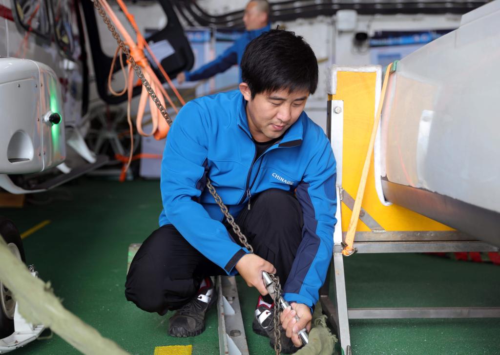 執(zhí)行中國第41次南極考察任務(wù)的“雪龍”號(hào)和“雪龍2”號(hào)于北京時(shí)間2024年11月19日開始穿越“咆哮”西風(fēng)帶。這是“雪龍2”號(hào)直升機(jī)機(jī)組成員畢凌峰在擰緊直升機(jī)固定件。新華社記者黃韜銘攝