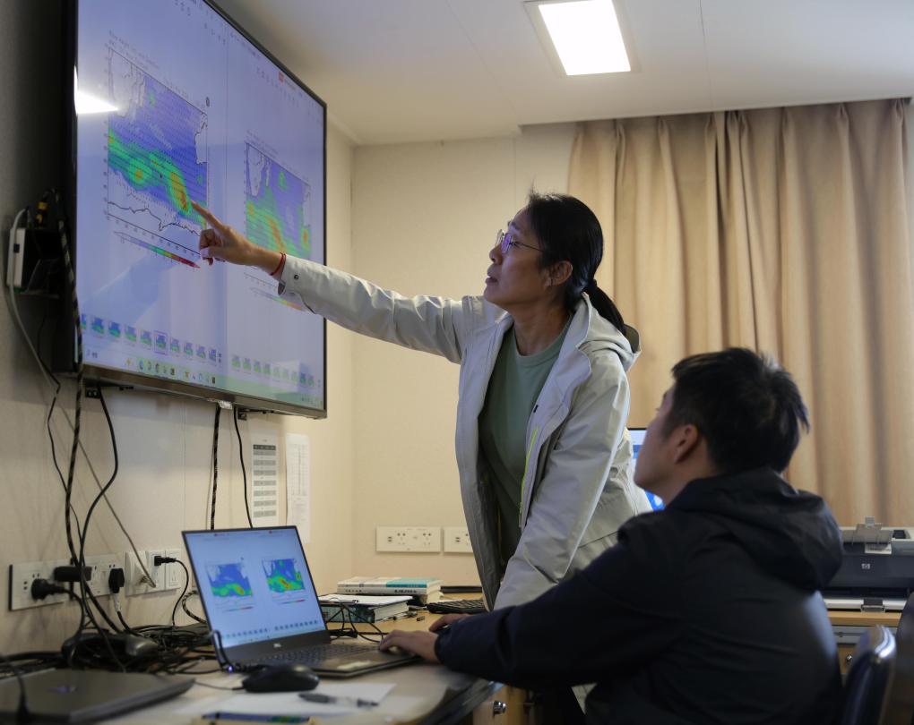 執(zhí)行中國第41次南極考察任務(wù)的“雪龍”號(hào)和“雪龍2”號(hào)于北京時(shí)間2024年11月19日開始穿越“咆哮”西風(fēng)帶。這是“雪龍2”號(hào)隨船氣象保障員劉素芳(左)在研判天氣情況,規(guī)劃航行路線。新華社記者黃韜銘攝