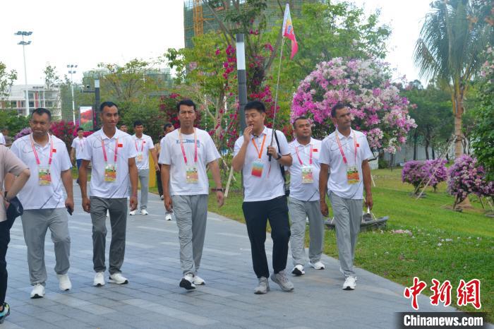 11月25日,海南三亞,第十二屆全國少數(shù)民族傳統(tǒng)體育運動會參賽代表團在三角梅科博園參觀考察。張月和 攝