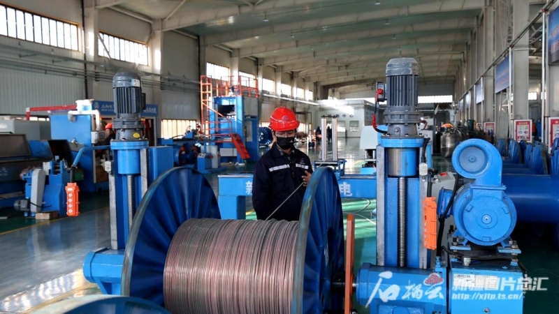新疆新東風(fēng)電纜有限公司生產(chǎn)車間內(nèi),工人正在忙碌加工產(chǎn)品。布仁巴特攝