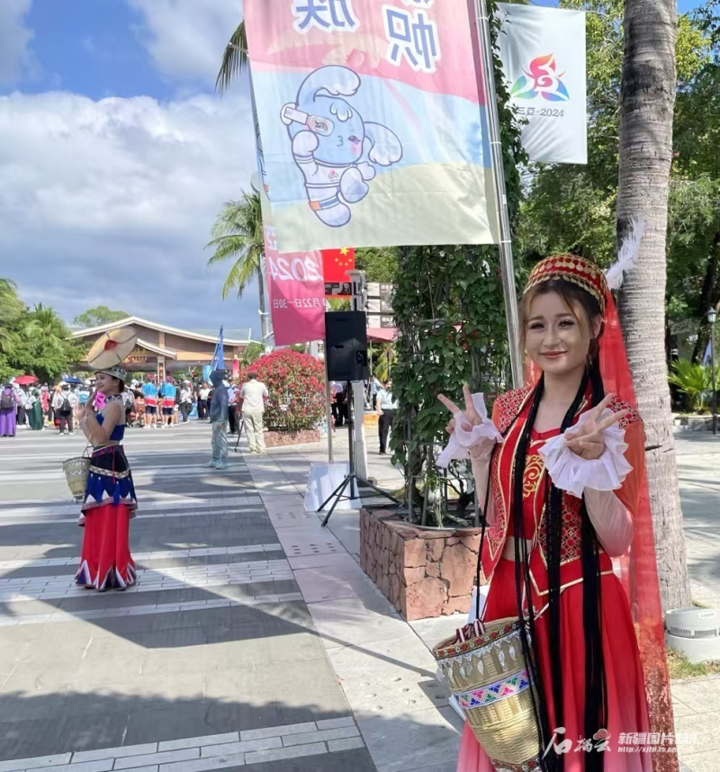 歡迎儀式的人群中,一頭麻花辮的艾麗非熱·艾爾肯非常引人注意,很多運(yùn)動(dòng)員前去與她合影,“我們排練一個(gè)月了,我要用最好的狀態(tài)為運(yùn)動(dòng)員加油,今天看見了很多家鄉(xiāng)的運(yùn)動(dòng)員,特別激動(dòng),等我表演完就去找他們合影?!卑惙菬峤榻B,她家在新疆阿克蘇,在三亞理工職業(yè)學(xué)院上大二,這幾天每天都在關(guān)注運(yùn)動(dòng)會(huì)的各類信息。