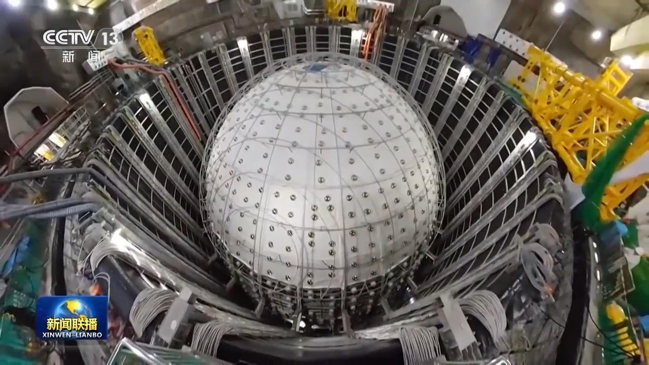 總臺央視記者 帥俊全:探測器主體建成之后,在這個(gè)約15層樓高的水池內(nèi)部將會注滿超純水,然后自上而下在有機(jī)玻璃球體內(nèi)部置換為液體閃爍體。從明年開始,整個(gè)裝置將正式運(yùn)行,開始捕獲、探測中微子,設(shè)計(jì)壽命為30年。