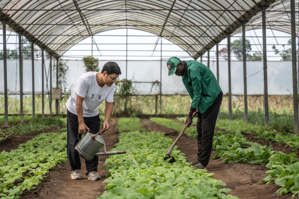 2024年8月3日,在剛果(布)首都布拉柴維爾的中國(guó)援剛果(布)農(nóng)業(yè)技術(shù)示范中心內(nèi),中方農(nóng)業(yè)專(zhuān)家李科明(左)與當(dāng)?shù)貑T工在大棚內(nèi)耕作。(新華社記者鄭揚(yáng)子攝)
