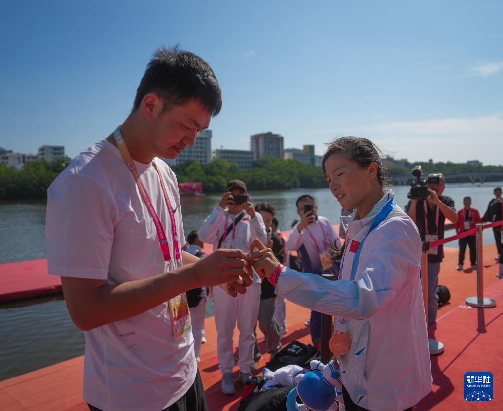 11月28日,何國(guó)潤(rùn)(右)的男朋友向她求婚。當(dāng)日,在海南省三亞市舉行的第十二屆全國(guó)少數(shù)民族傳統(tǒng)體育運(yùn)動(dòng)會(huì)獨(dú)竹漂女子組200米直道賽頒獎(jiǎng)儀式后,海南隊(duì)選手何國(guó)潤(rùn)的男朋友在頒獎(jiǎng)儀式現(xiàn)場(chǎng)向她求婚,上演溫情一幕。新華社發(fā)(杜笑微 攝)