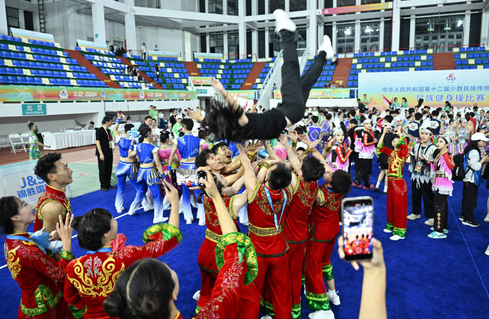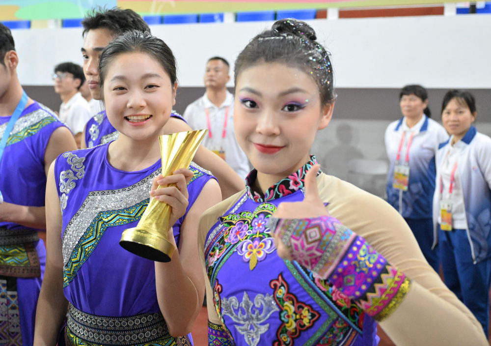 11月28日,西藏隊(duì)運(yùn)動(dòng)員慶祝團(tuán)隊(duì)獲得民族健身操自選套路(輕器械)一等獎(jiǎng)。