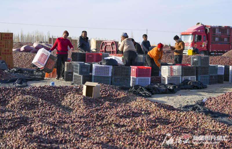 11月29日,策勒縣農(nóng)民在晾曬場搬運紅棗。