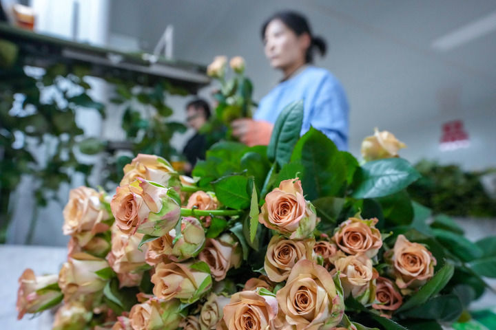 2024年8月23日,在云南晉寧花卉產(chǎn)業(yè)現(xiàn)代化示范園采后處理中心,花農(nóng)將鮮切花放入自動分揀流水線上進行分揀。新華社記者 陳欣波 攝