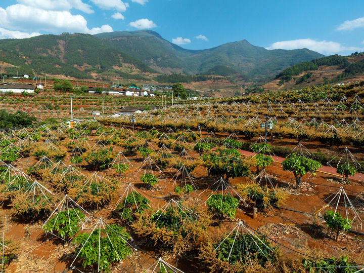 這是2024年4月9日拍攝的四川省攀枝花市米易縣新山傈僳族鄉(xiāng)中山村芒果產(chǎn)業(yè)園(無人機照片)。新華社記者 沈伯韓 攝
