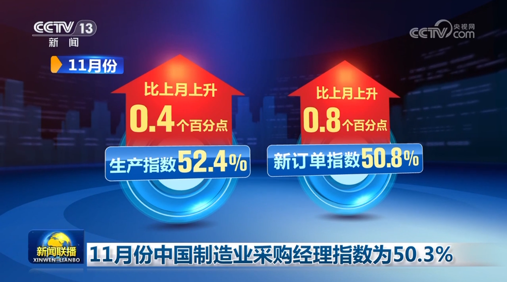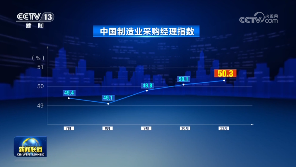 中國物流與采購聯(lián)合會(huì)、國家統(tǒng)計(jì)局11月30日公布11月份中國制造業(yè)采購經(jīng)理指數(shù)。隨著一系列存量政策和增量政策持續(xù)協(xié)同發(fā)力,制造業(yè)采購經(jīng)理指數(shù)擴(kuò)張步伐有所加快,我國經(jīng)濟(jì)景氣水平總體保持穩(wěn)定擴(kuò)張。