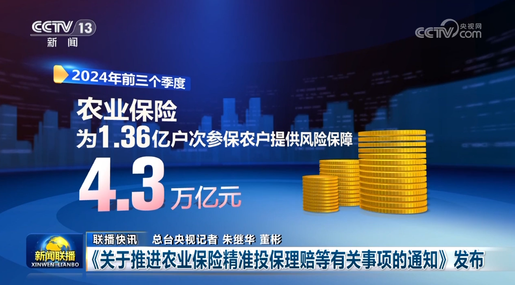 金融監(jiān)管總局等四部門近日聯(lián)合發(fā)布通知,對(duì)農(nóng)業(yè)保險(xiǎn)投保理賠、應(yīng)收保費(fèi)、條款費(fèi)率、數(shù)據(jù)共享等提出要求,進(jìn)一步提高投保理賠精準(zhǔn)性,推動(dòng)我國農(nóng)業(yè)保險(xiǎn)高質(zhì)量發(fā)展。今年前三個(gè)季度,農(nóng)業(yè)保險(xiǎn)為1.36億戶次參保農(nóng)戶提供風(fēng)險(xiǎn)保障4.3萬億元。