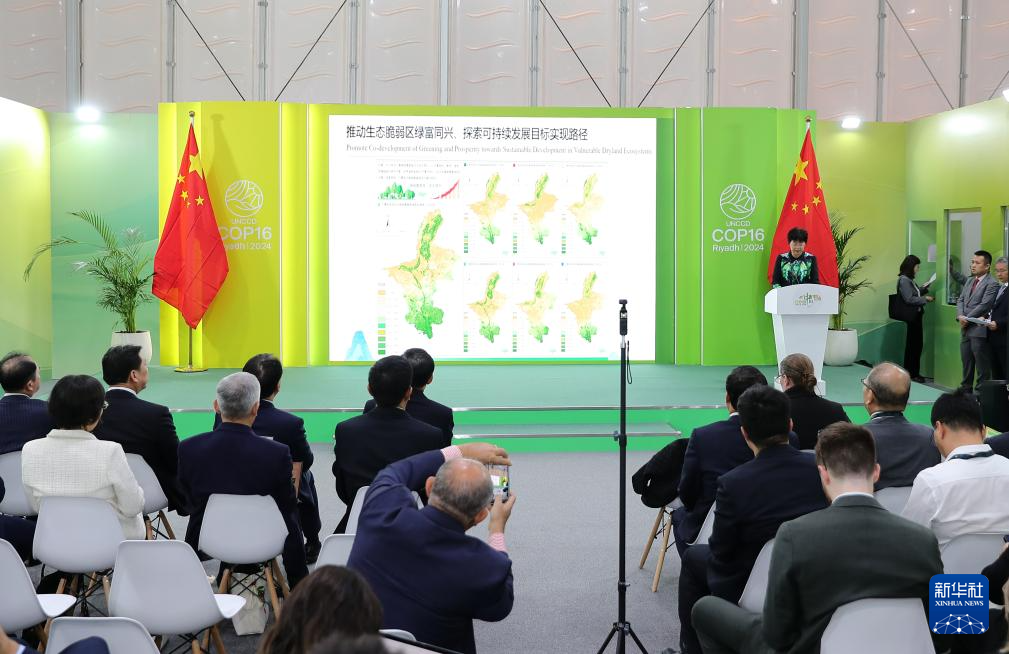 這是12月4日在沙特阿拉伯利雅得《聯(lián)合國防治荒漠化公約》第十六次締約方大會(COP16)中國館拍攝的邊會現(xiàn)場?!堵?lián)合國防治荒漠化公約》第十六次締約方大會(COP16)中國館4日下午舉辦首場邊會,向全球介紹荒漠化防治的“寧夏經(jīng)驗”。新華社記者 王東震 攝