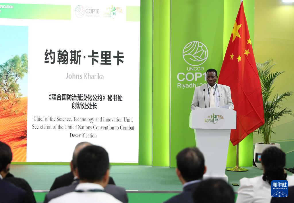 12月4日,在沙特阿拉伯利雅得《聯(lián)合國防治荒漠化公約》第十六次締約方大會(COP16)中國館,《公約》秘書處創(chuàng)新處處長約翰斯·卡里卡在邊會上發(fā)言。新華社記者 王東震 攝