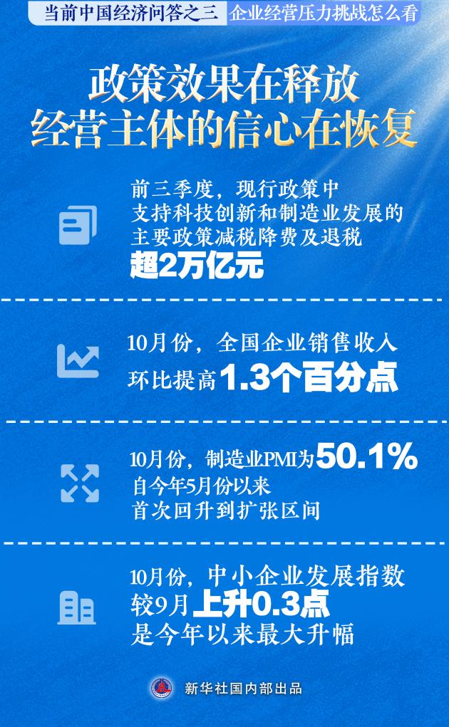 10月份,全國(guó)企業(yè)銷(xiāo)售收入同比增長(zhǎng),環(huán)比提高1.3個(gè)百分點(diǎn);制造業(yè)PMI為50.1%,自今年5月份以來(lái)首次回升到擴(kuò)張區(qū)間;非制造業(yè)商務(wù)活動(dòng)指數(shù)連續(xù)數(shù)月穩(wěn)定在50%左右;中小企業(yè)發(fā)展指數(shù)較9月上升0.3點(diǎn),是今年以來(lái)最大升幅。
