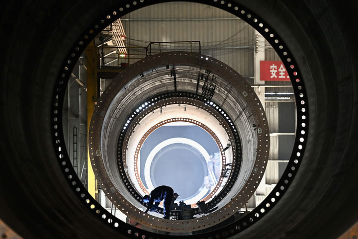 2024年4月23日,新疆木壘哈薩克自治縣民生工業(yè)園區(qū)木壘泰勝風(fēng)能裝備有限公司工人在生產(chǎn)線上生產(chǎn)風(fēng)力發(fā)電機(jī)塔筒。新華社記者 王菲 攝