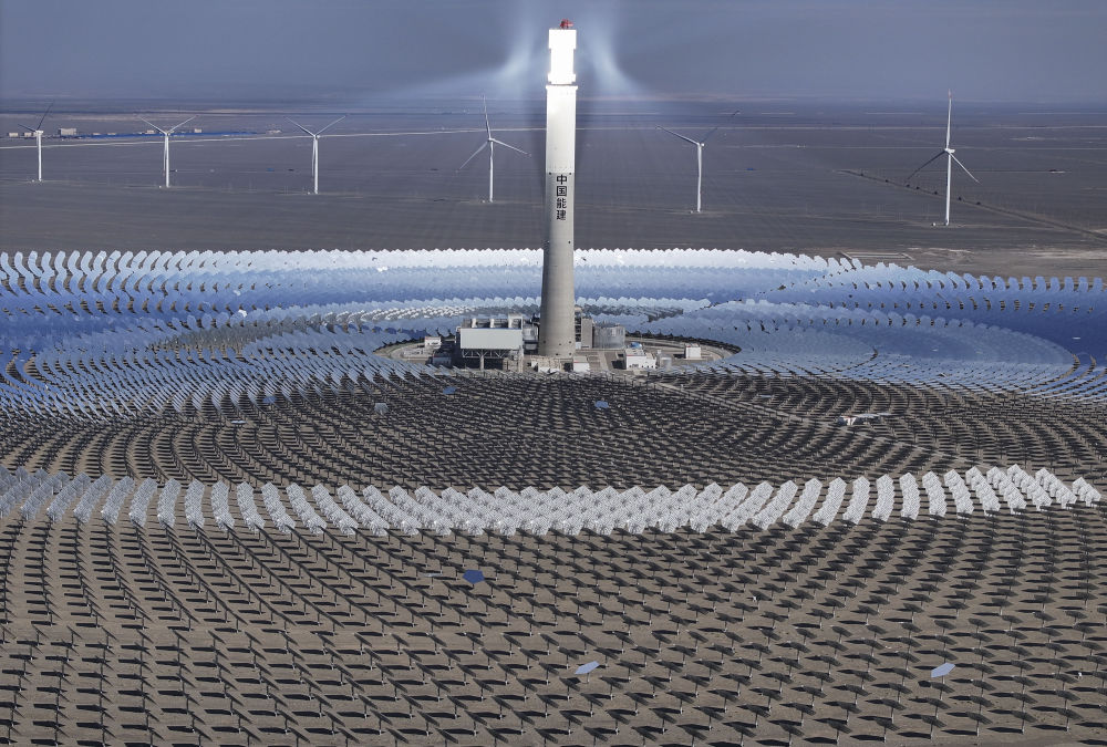 這是2024年9月12日在新疆哈密市伊吾縣淖毛湖鎮(zhèn)拍攝的國(guó)家光熱示范項(xiàng)目——熔鹽塔式50兆瓦光熱發(fā)電站(無人機(jī)照片)。新華社記者 胡虎虎 攝