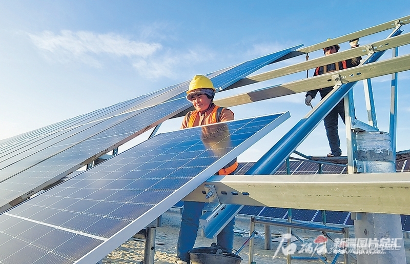 12月1日,位于和田市吉亞鄉(xiāng)的華潤新能源50萬千瓦光伏治沙項目施工現(xiàn)場一派熱火朝天景象。該項目總投資約15億元,預計明年5月底實現(xiàn)全容量投產。圖為工人在鋪設光伏板。 石榴云/新疆日報記者 湯永攝