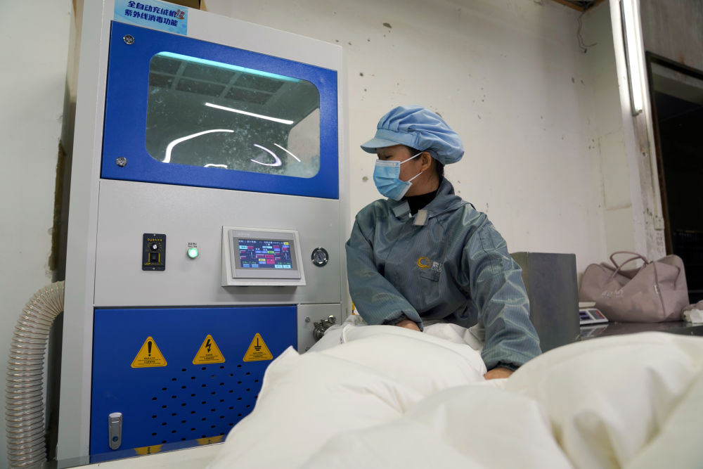 在橋圩鎮(zhèn)一家羽絨制品生產(chǎn)車(chē)間內(nèi),工人使用全自動(dòng)充絨機(jī)制作羽絨被。新華社記者 楊馳 攝
