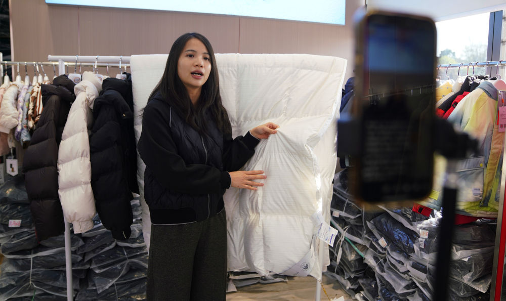 在橋圩羽絨產(chǎn)業(yè)園展示廳,銷(xiāo)售人員正在直播介紹當(dāng)?shù)厣a(chǎn)的羽絨被。新華社記者 楊馳 攝