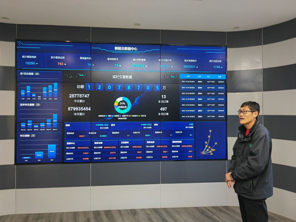 在子牙經(jīng)開區(qū)的“新能云數(shù)據(jù)中心”,巨大電子屏幕上實(shí)時(shí)顯示著新能公司與全國資源回收下游企業(yè)在銅、鋁等方面的訂單。目前,平臺線上交易商家已達(dá)18000余戶,輻射全國80%地區(qū),近3年累計(jì)回收各類再生資源400多萬噸,線上交易額近千億元。