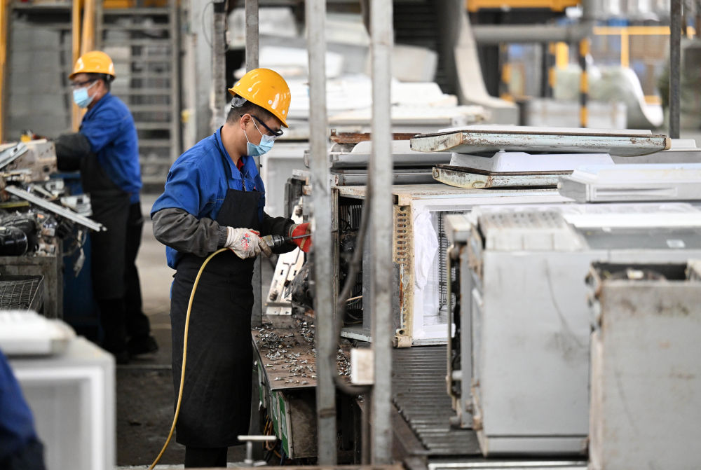 TCL奧博(天津)環(huán)保發(fā)展有限公司工人在拆解冰箱。新華社記者 趙子碩 攝