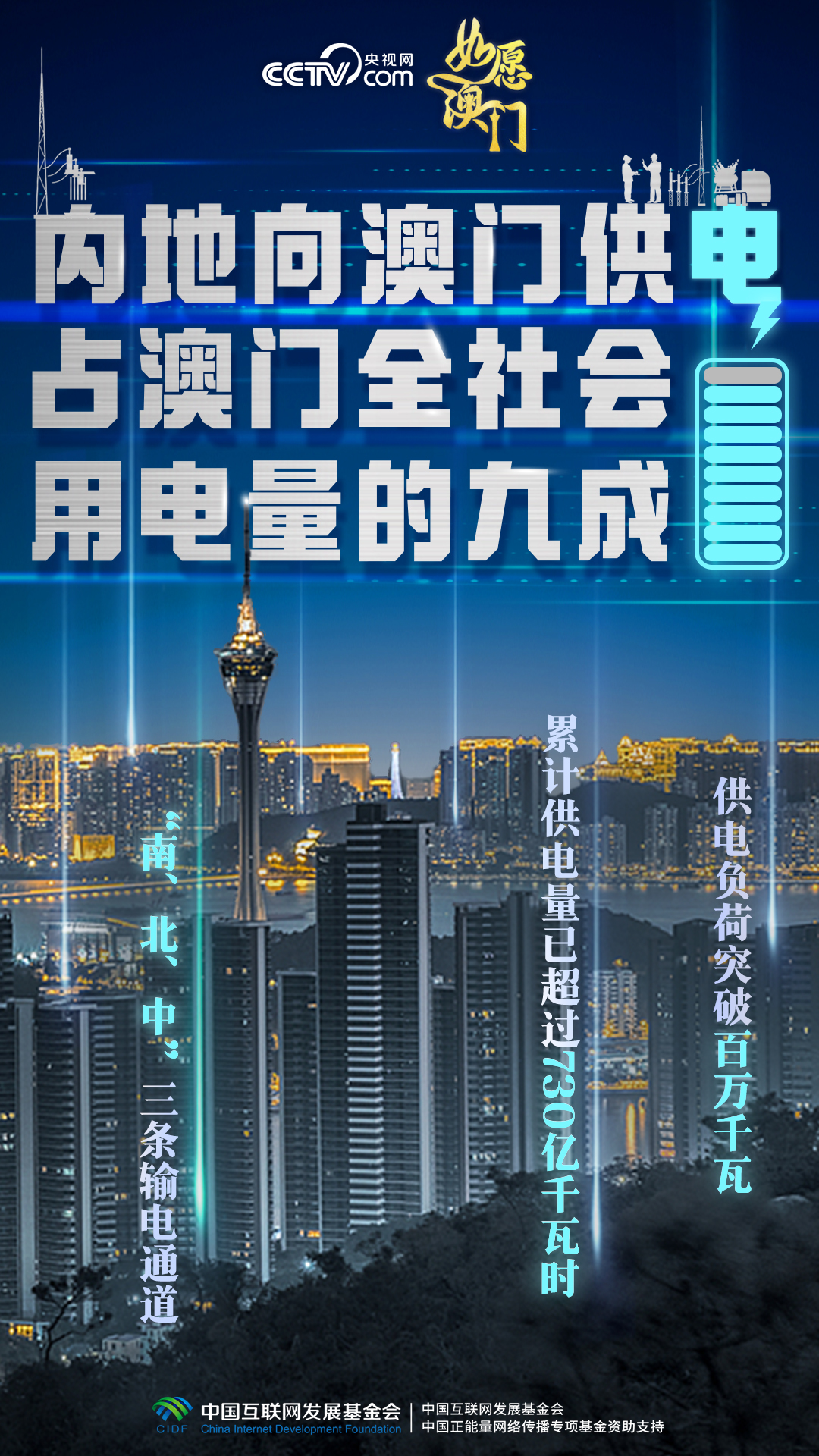 澳門(mén)缺電,南海油氣田里伸出專(zhuān)供澳門(mén)發(fā)電的天然氣管道,粵澳“南、北、中”三條輸電通道接續(xù)架設(shè),條條“銀線”相連,為澳門(mén)經(jīng)濟(jì)社會(huì)發(fā)展注入源源不斷的強(qiáng)勁動(dòng)能。1999年回歸當(dāng)年,內(nèi)地對(duì)澳供電量為1.95億千瓦時(shí);2024年7月,內(nèi)地向澳門(mén)供電負(fù)荷突破百萬(wàn)千瓦,累計(jì)供電量已超過(guò)730億千瓦時(shí)。