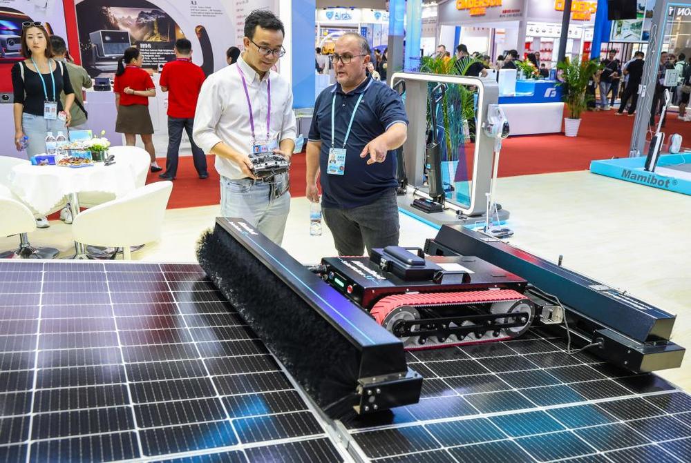 10月15日,采購商在第136屆廣交會展館了解一款太陽能面板自動清潔機器人產(chǎn)品。(新華社記者 劉大偉 攝)