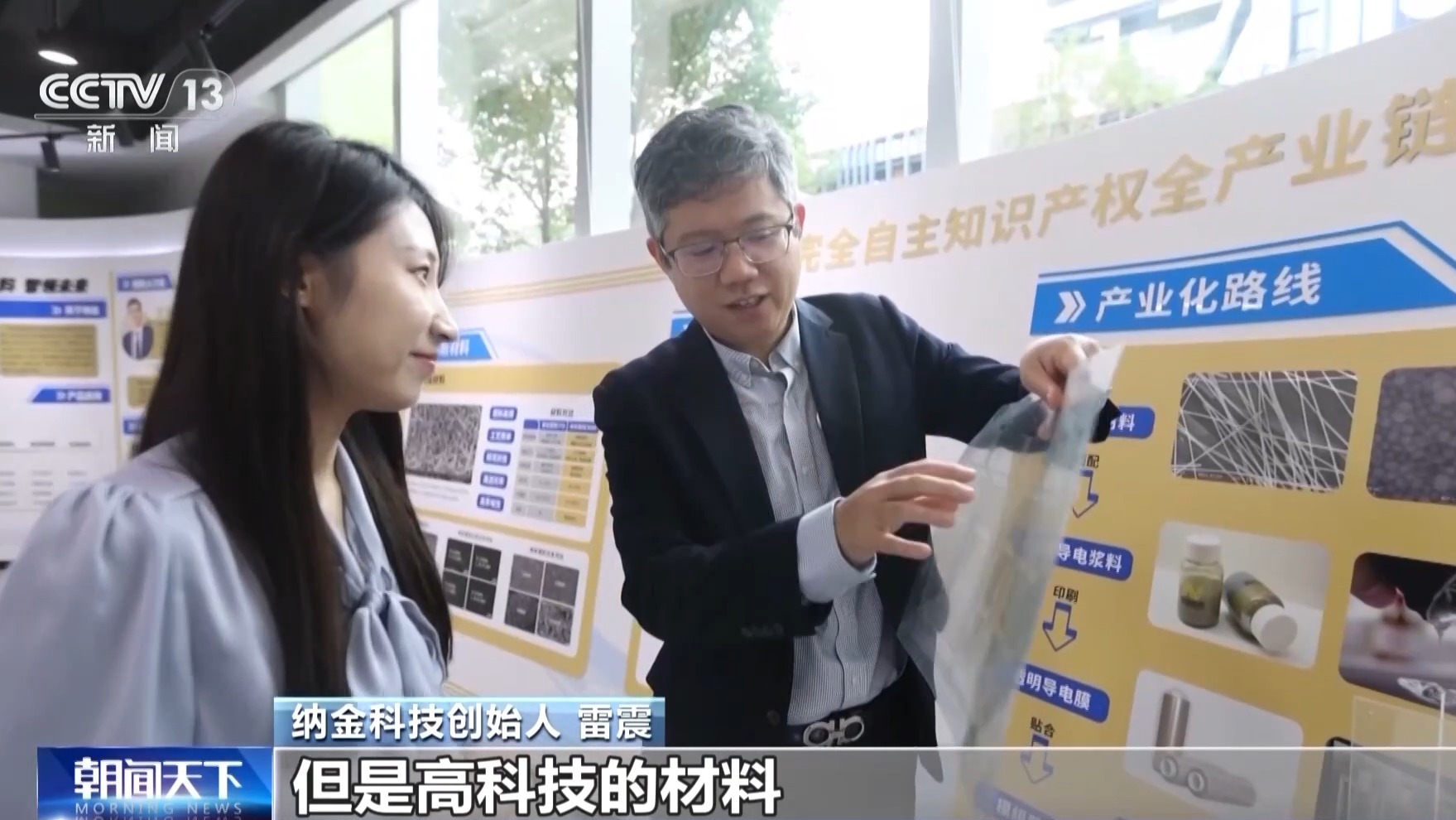 納金科技創(chuàng)始人 雷震:平平無(wú)奇的一張膜,但是高科技的材料已經(jīng)富含在里面了,這些位置印刷了一層納米銀線的材料,直徑大約相當(dāng)于人頭發(fā)絲的萬(wàn)分之一,柔性、耐彎折、靈敏度高、電阻更低、功耗更小,成本還能比傳統(tǒng)的薄膜降低30%左右,所有的材料和印刷工藝都是我們自己的技術(shù),完全自主可控。
