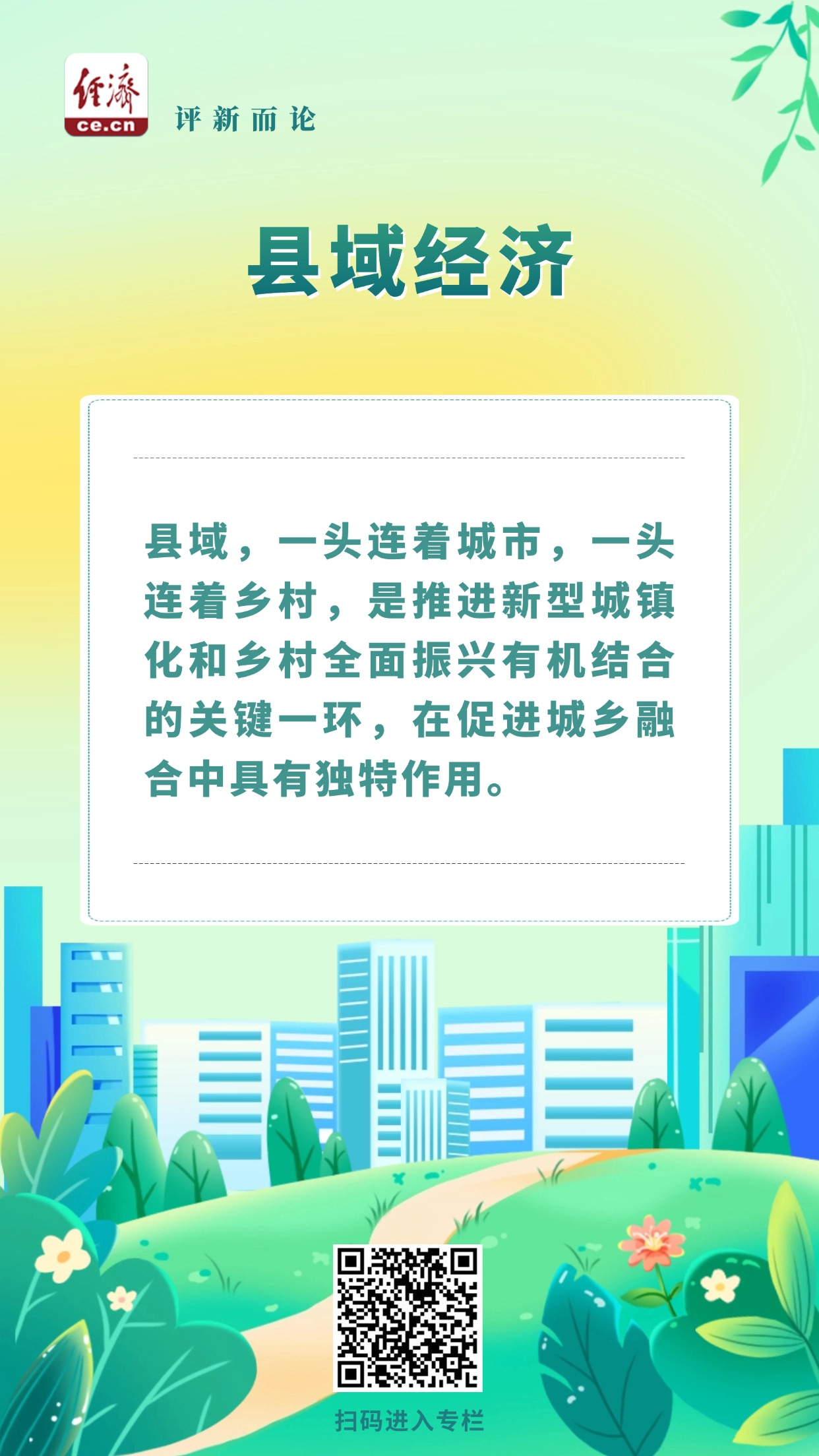 縣域,一頭連著城市,一頭連著鄉(xiāng)村,是推進(jìn)新型城鎮(zhèn)化和鄉(xiāng)村全面振興有機(jī)結(jié)合的關(guān)鍵一環(huán),在促進(jìn)城鄉(xiāng)融合中具有獨(dú)特作用。因此,發(fā)展壯大縣域經(jīng)濟(jì),還要把縣域發(fā)展納入城鄉(xiāng)融合、區(qū)域協(xié)調(diào)發(fā)展的大格局中。在完善自身基礎(chǔ)設(shè)施建設(shè)、提高公共服務(wù)水平的過(guò)程中,縣域要充分發(fā)揮連接城鄉(xiāng)發(fā)展的“橋梁”作用,不僅讓各類優(yōu)勢(shì)資源、公共服務(wù)從城市逐步向鄉(xiāng)村延伸,也讓越來(lái)越多的美麗鄉(xiāng)村被發(fā)掘和點(diǎn)亮。