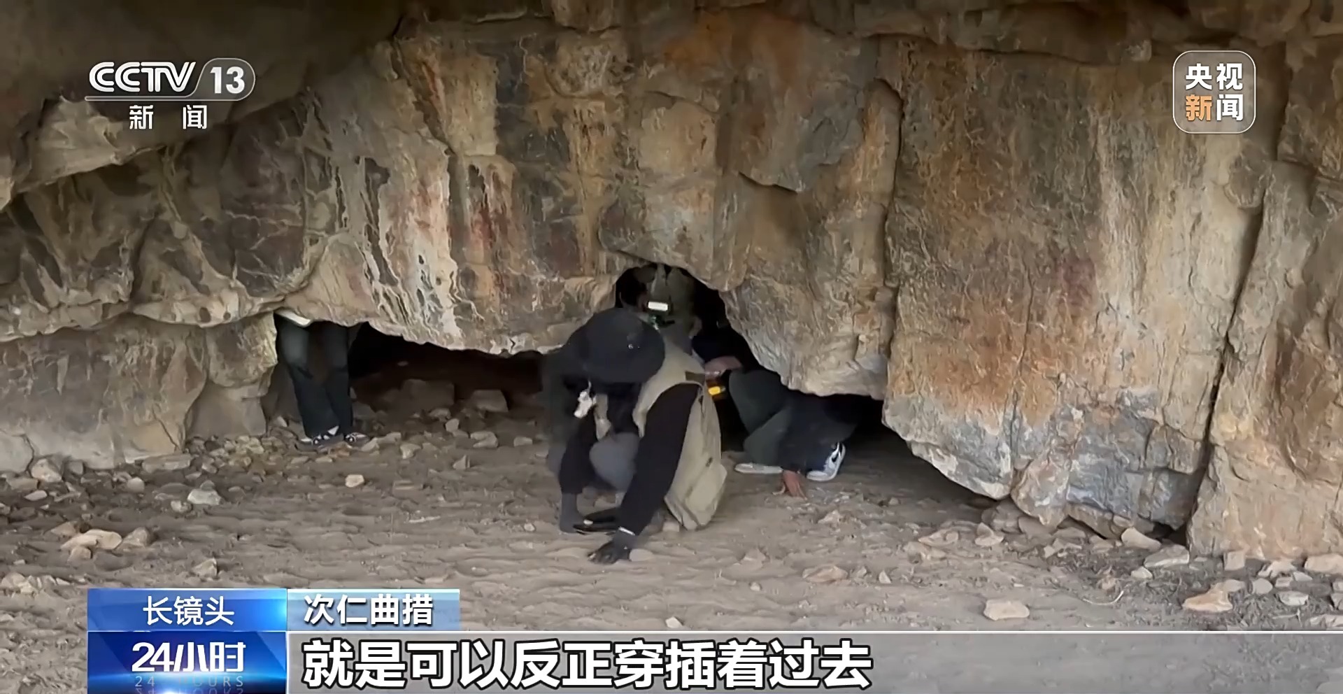 次仁曲措:當(dāng)?shù)氐南驅(qū)дf(shuō)洞里面還有幾個(gè)巖畫(huà),我們就趴著進(jìn)去了。洞里面還有幾個(gè)洞口,可以穿插著過(guò)去,感覺(jué)像拆盲盒一樣,非常好奇,想迫不及待地知道洞口有哪個(gè)巖畫(huà),這些人像在跳舞或者在舉行某種儀式。