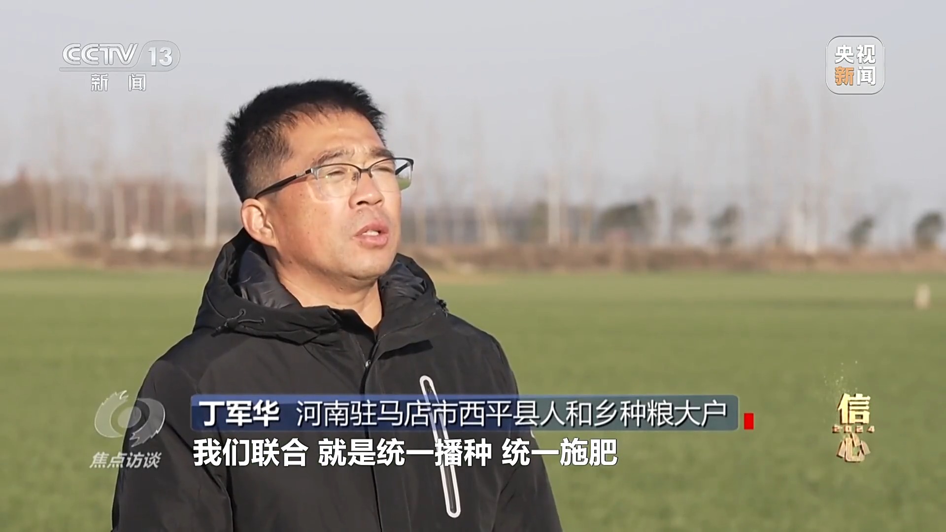 河南駐馬店市西平縣仁和鄉(xiāng)種糧大戶 丁軍華:“我們聯(lián)合就是統(tǒng)一播種、統(tǒng)一施肥、統(tǒng)一管理、統(tǒng)一打藥、統(tǒng)一購銷和統(tǒng)一收割,做到了‘六統(tǒng)一’,共同抱團去跟廠家談判、爭取最低的價格。這一次小麥播種,我們從黑龍江引進大型氣吸型播種機,地少了它不來,用這種播種機,一畝地比普通播種機增產(chǎn)15%以上。”