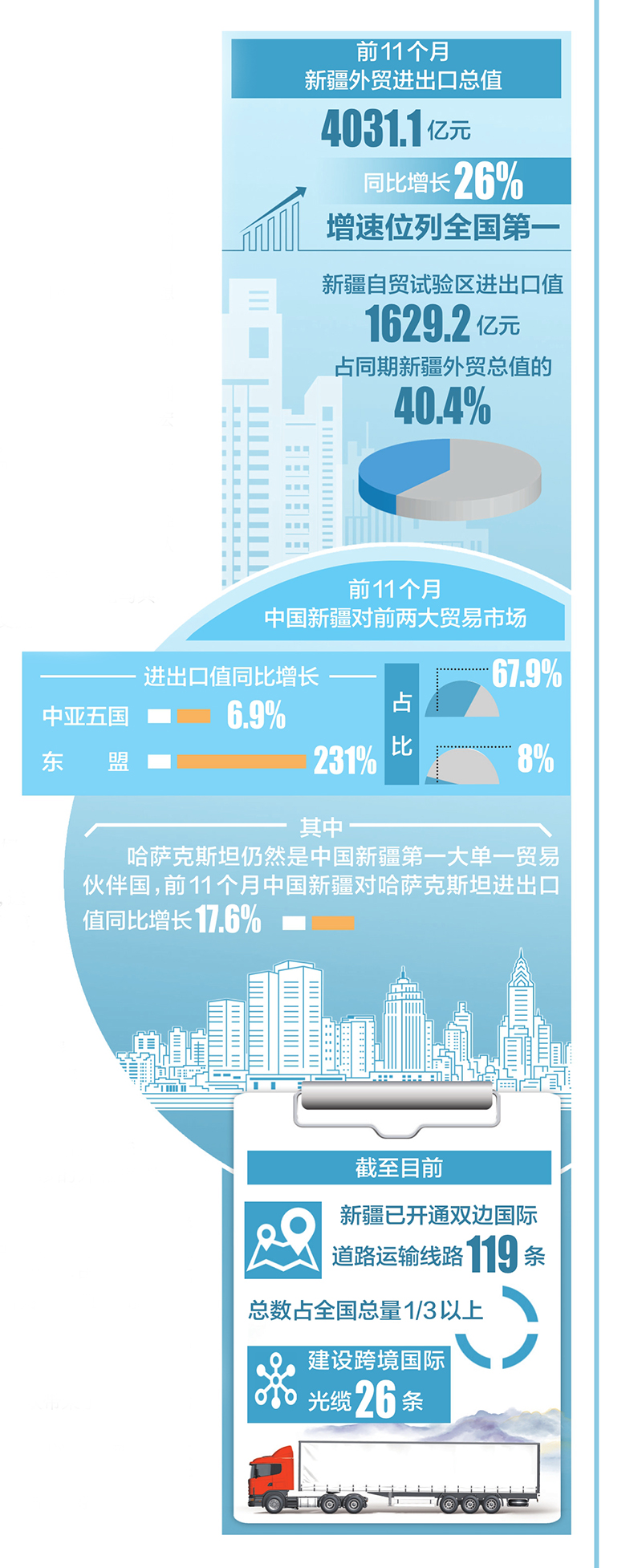 新疆自貿(mào)試驗區(qū)賦能效應持續(xù)顯現(xiàn)。烏魯木齊海關數(shù)據(jù)顯示,前11個月,新疆自貿(mào)試驗區(qū)進出口值1629.2億元,占同期新疆外貿(mào)總值的40.4%。