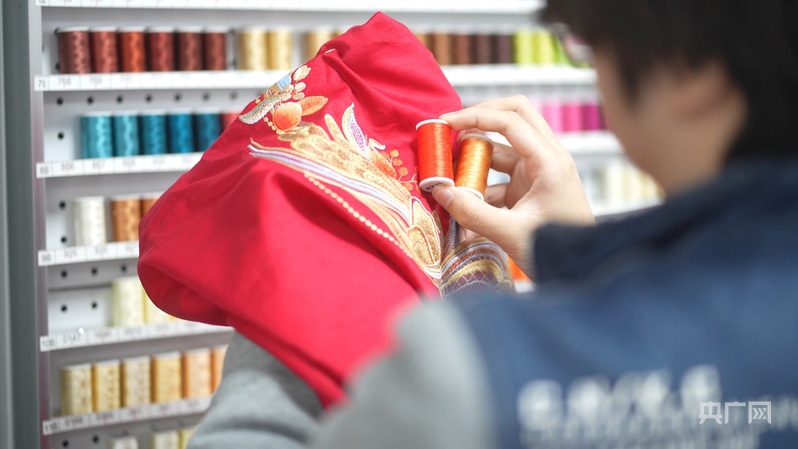 家紡企業(yè)內(nèi),設(shè)計師在眾多繡花線中選色(央廣網(wǎng)記者 王姝姝 攝)