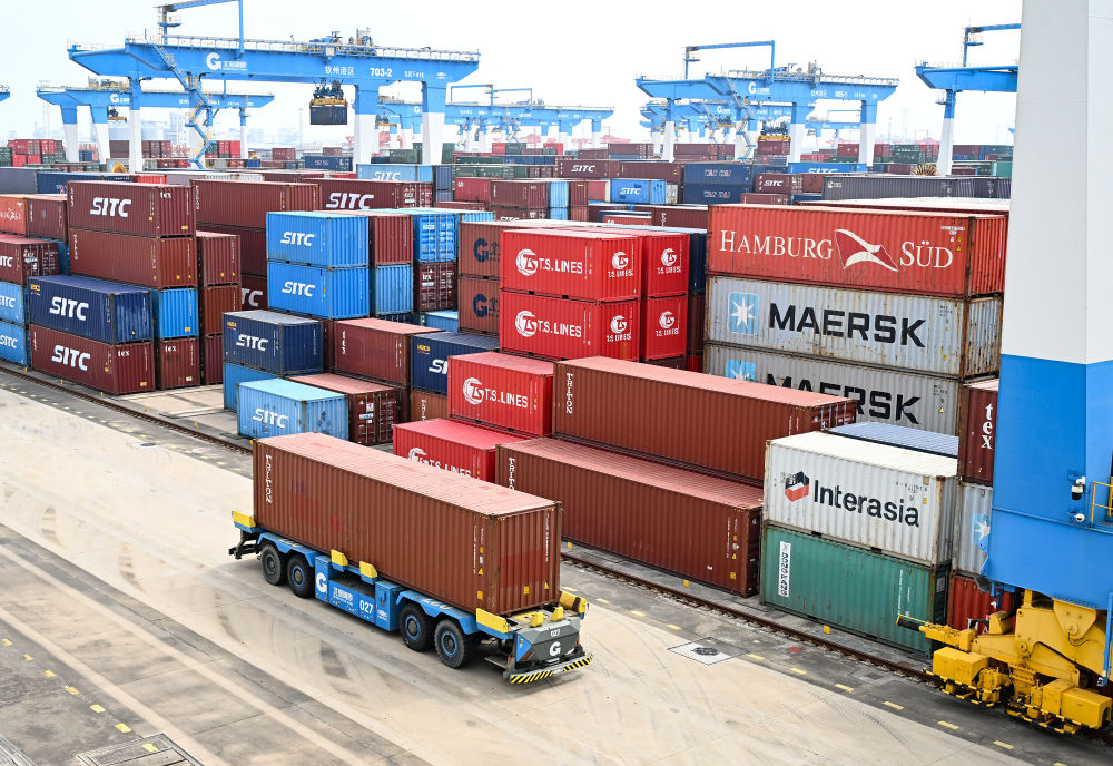 2024年10月20日,在廣西北部灣港欽州港區(qū)碼頭,一輛自動化無人轉(zhuǎn)運車在運送集裝箱。各式各樣運往東盟各國的貨物在這個海鐵聯(lián)運自動化集裝箱碼頭實現(xiàn)“下船即上車、下車即上船”。新華社記者李賀攝